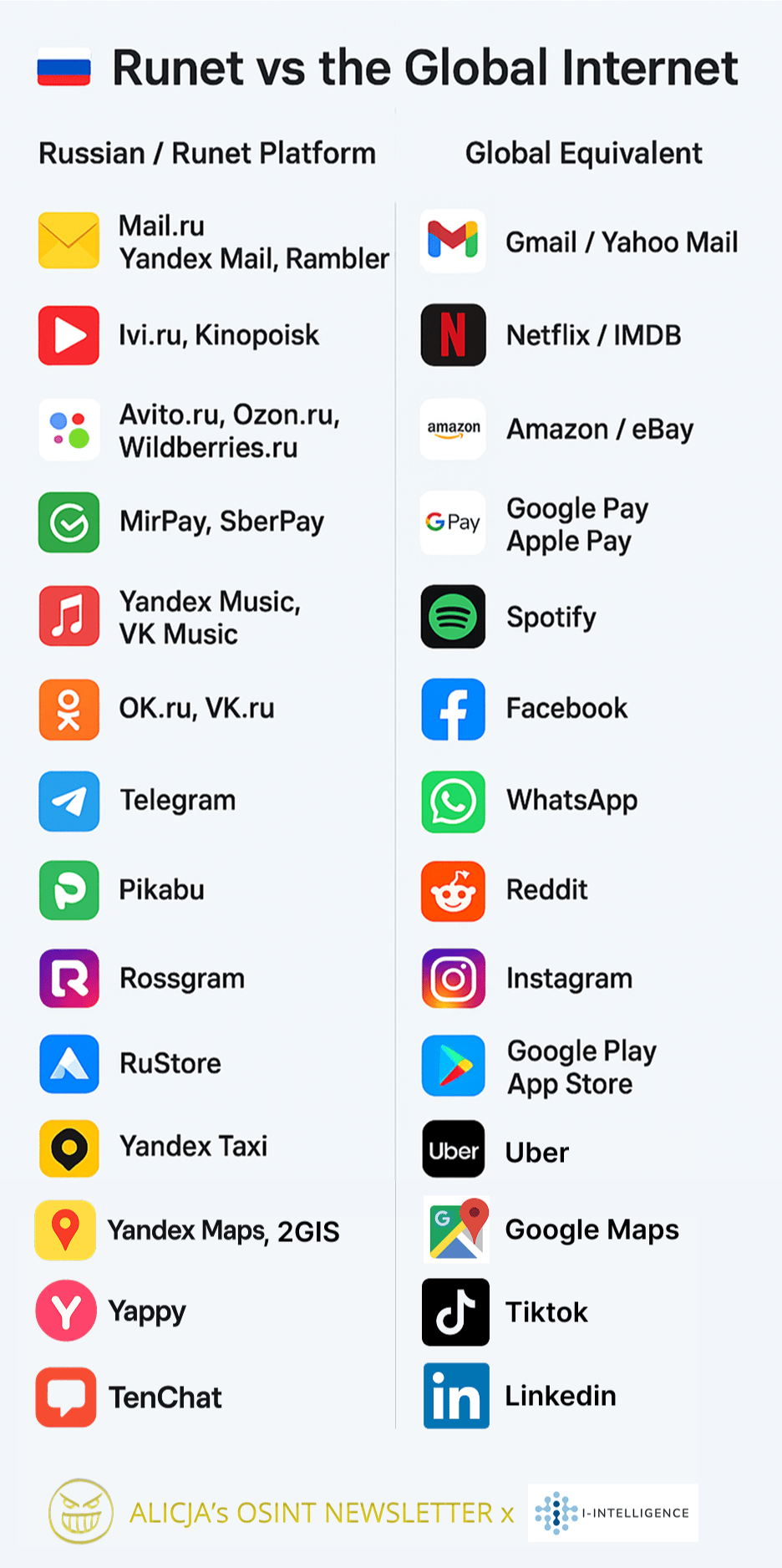 Understanding RuNet means also understanding distinct ecosystem of platforms, data sources, and access limitations. Unlike the Western web, RuNet relies heavily on domestic services like VK (VKontakte), OK (Odnoklassniki), Yandex, Mail[.]ru, and hundreds more local solutions that cover all domains online. Open data often hides in plain sight. For example, military related information is available in a wide range of sources varying from soldiers’ social media posts, recruitment pages, and veterans’ groups on VK, to public procurement and contracting portals. Furthermore, laws and regulations of RuNet are becoming tighter, and access to services may require deeper authentication or even a use of VPN with a Russian or Russia-friendly IP address.