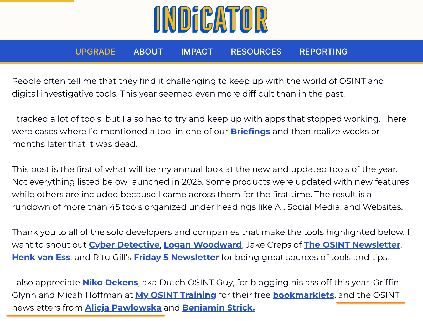 Before we jump in, I wanted to say a quick thank you. Craig Silverman from Indicators recently published a roundup of new and updated OSINT and investigative tools, and I was really happy (to be honest a little surprised) to see myself mentioned among top OSINT voices.