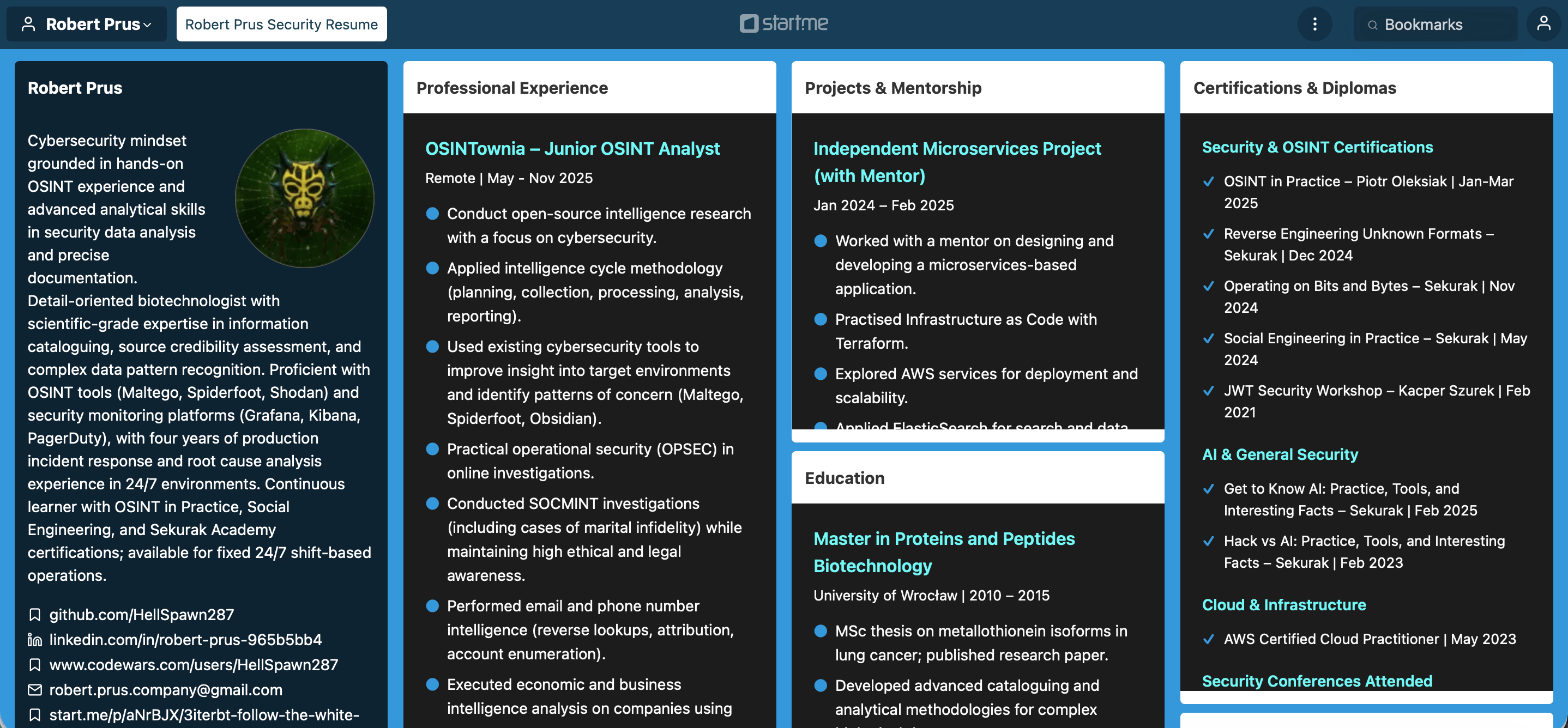 Robert is a junior OSINT analyst with commercial experience and an unusual background in biotechnology studies, where source criticism and precise reporting were non-negotiable. That scientific discipline underpins his approach to the intelligence cycle: structured, methodical, and allergic to routine. He built his own Start[.]me dashboard, organised by selector type and technique maturity to reduce cold-start friction at the beginning of every nvestigation.